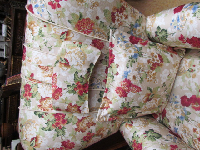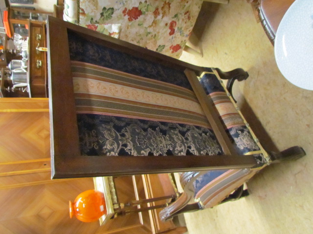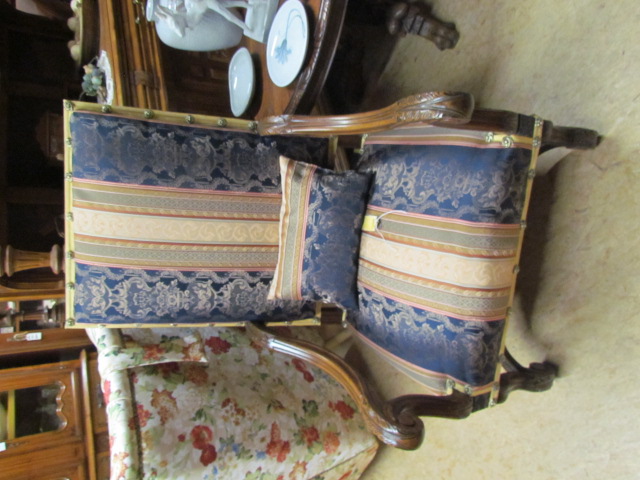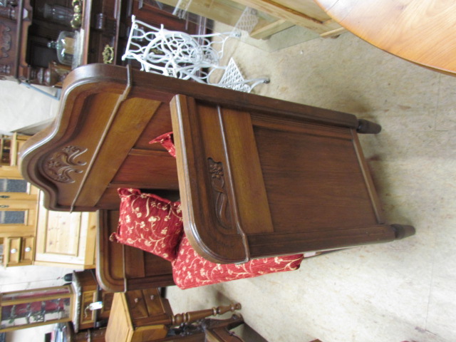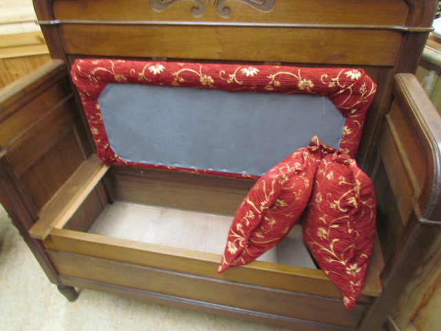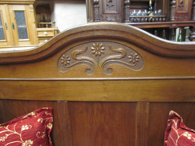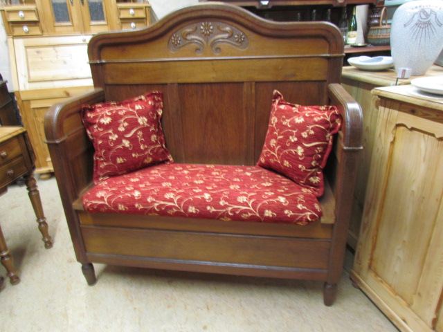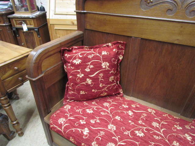 Sitzbank aus massivem Eichenholz um 1910 aus der Jugendstil Zeit. Die Bank wurde aus einem alten Bett gebaut. Es wurde im unteren Teil ein Staukasten eingebaut. Die Sitzfläche wurde mit einem hochwertigen Polsterstoff bezogen, dabei sind noch zwei kleine Kissen. |