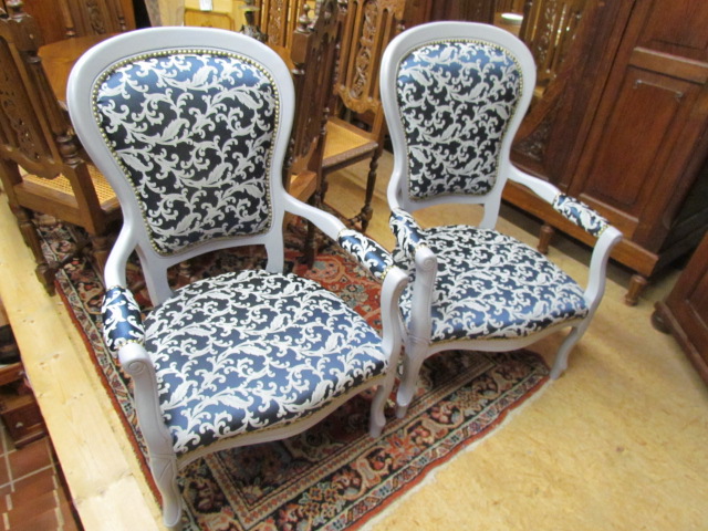 Sehr schöne Sessel aus Frankreich . Das Gestell ist grau lackiert. Sie wurden neu Bezogen mit hochwertigen Bezugsstoff. Auch Einzel zu erwerben .