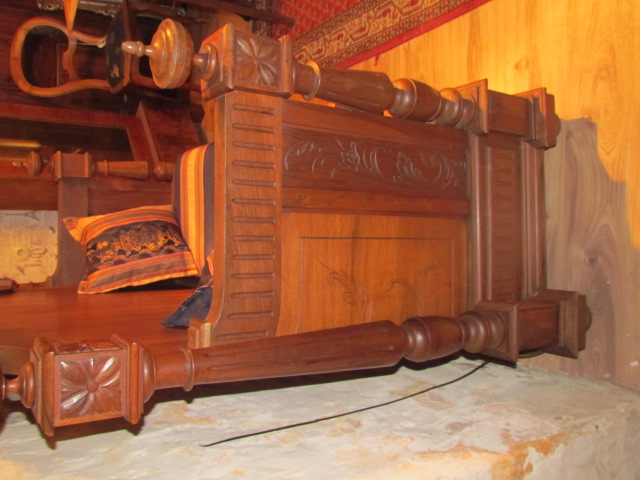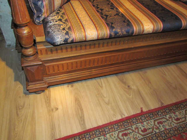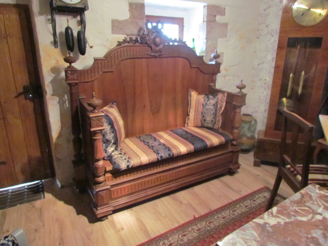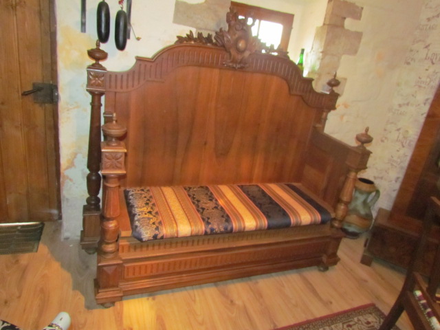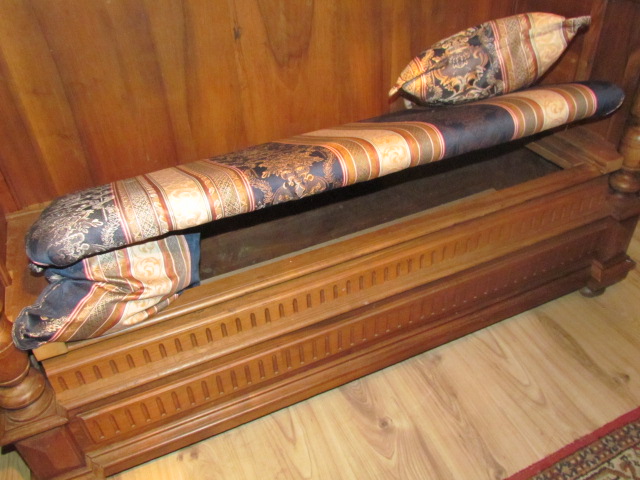 Große Sitzbank, um 1900. Sie ist aus Nussbau und wurde aus einem alten Bett gebaut. Mit einem Staufach unter der Sitzfläche. Die Sitzfläche ist mit einem hochwertigen Polsterstoff bezogen, mit zwei Kissen.