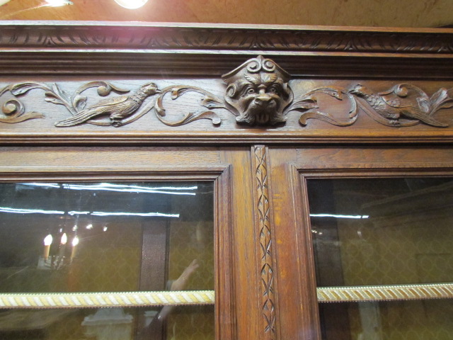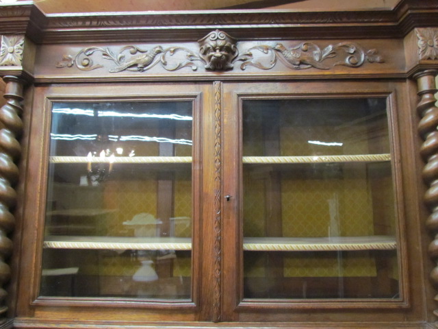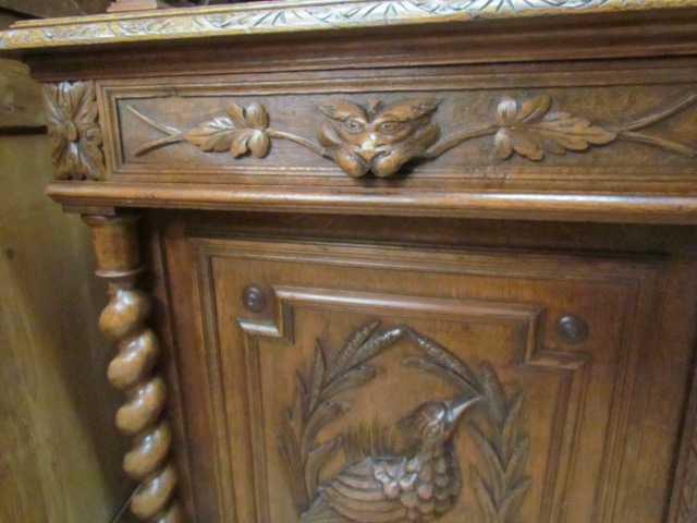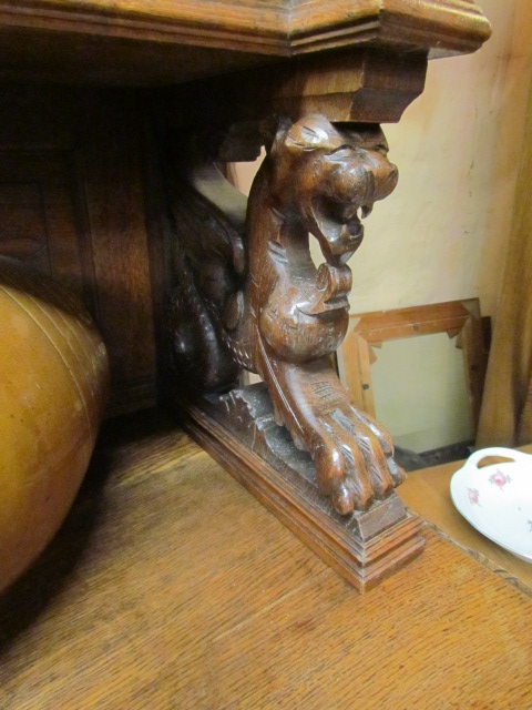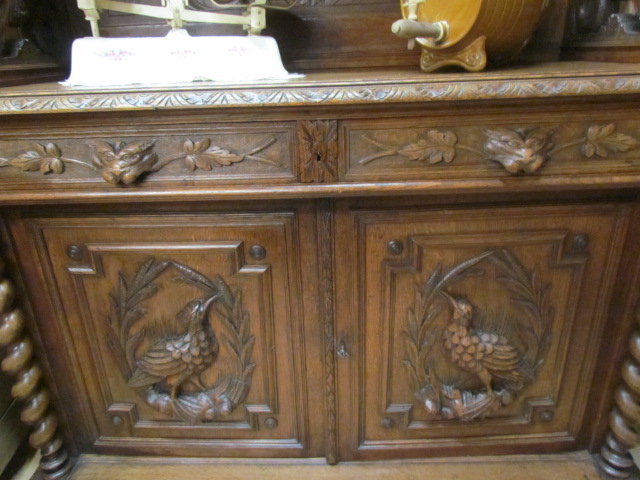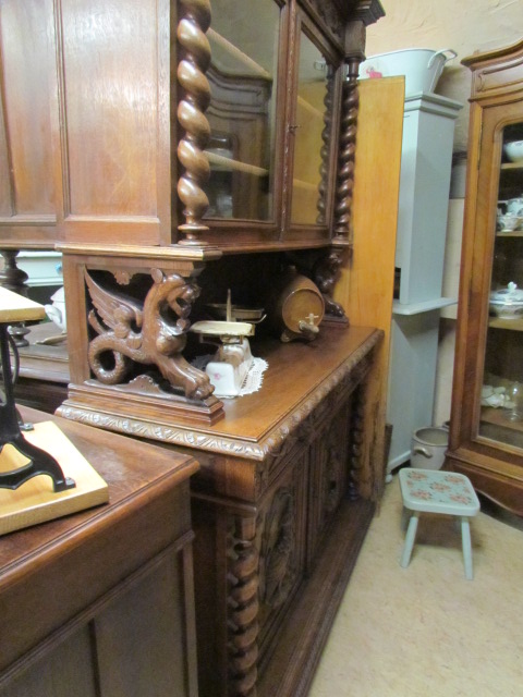 Großes Jagd Buffet aus Frankreich in massiven Eichenholz gefertigt.Seitlich mit Korkenzieher Säulen, die Türen Schubladen und Kopfteil sehr schön geschnitzt.Im Mittelteil zwei geschnitzte Drachen als Säulen. Im Oberteil sind zwei verstellbare Einlege Böden .Die Beschläge sind original.Das Buffet ist Wohn fertig restauriert.