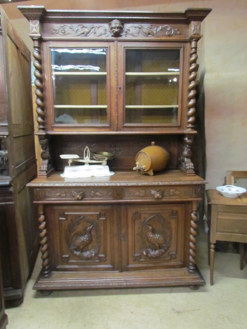 Originelles kleines Jagd Buffet aus Frankreich um 1900.Das Buffet ist teil massiv aus Nussbaum Holz.Die Türen sind oben mit sehr schönen geschnitzten Jagdmotiven gestaltet. Unteren Türen mit Henry II Motiven.Mittel Teil mit Säulen und ein Teller Regal. Im Oberteil sind zwei verstellbare Einlege Böden unten ein Boden.Die Beschläge sind original.Das Buffet ist Wohn fertig restauriert.