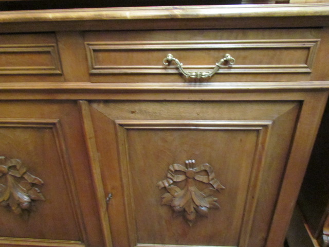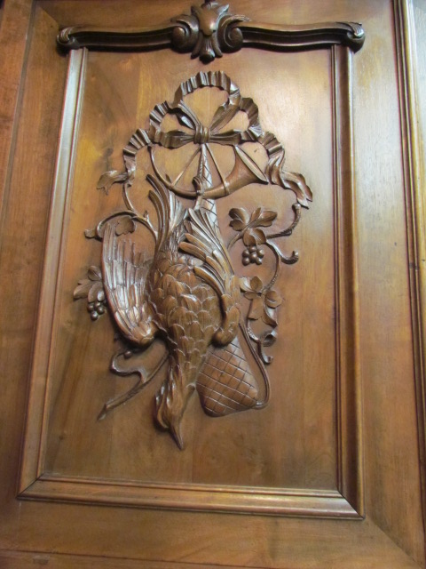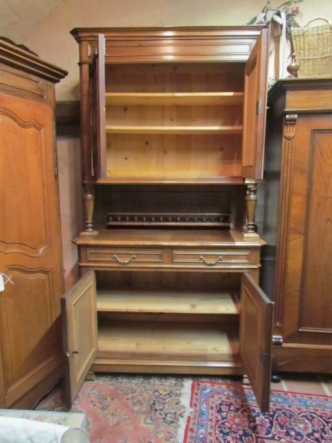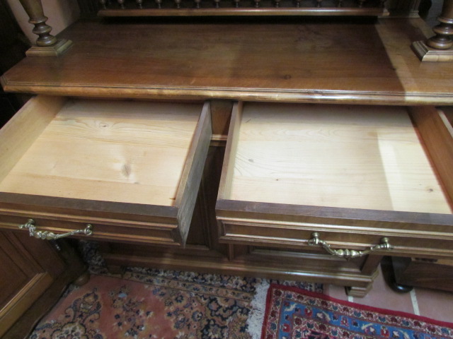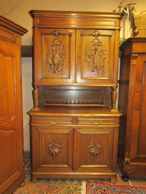Originelles kleines Jagd Buffet aus Frankreich um 1900.Das Buffet ist teil massiv aus Nussbaum Holz.Die Türen sind oben mit sehr schönen geschnitzten Jagdmotiven gestaltet. Unteren Türen mit Henry II Motiven.Mittel Teil mit Säulen und ein Teller Regal. Im Oberteil sind zwei verstellbare Einlege Böden unten ein Boden.Die Beschläge sind original.Das Buffet ist Wohn fertig restauriert.