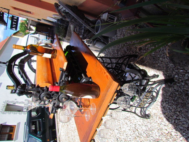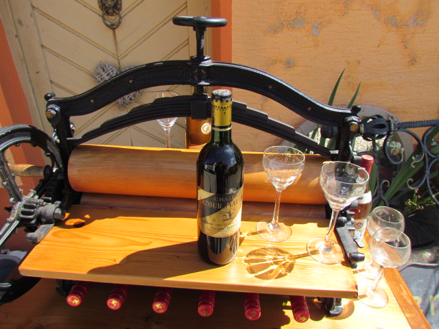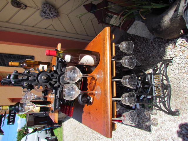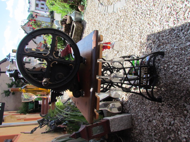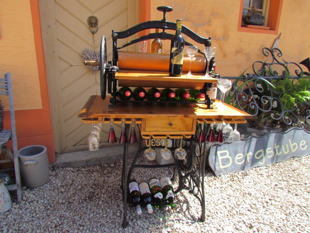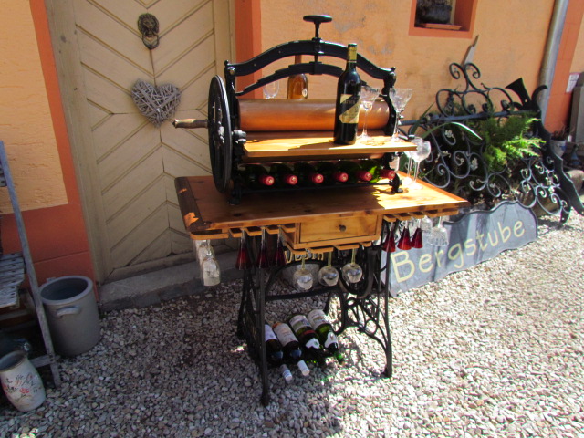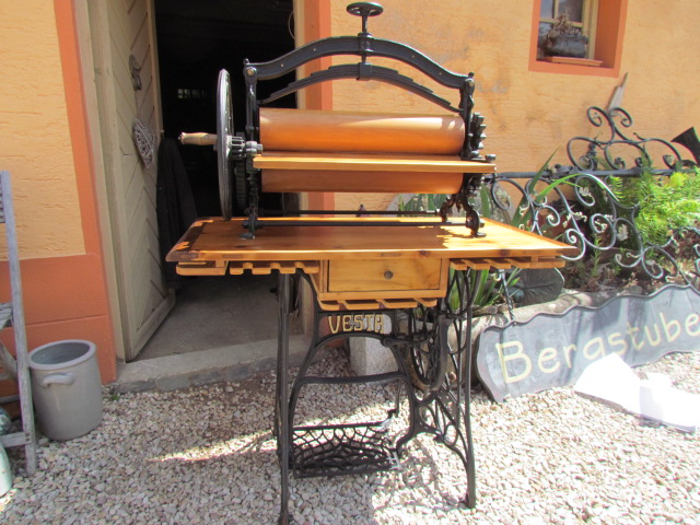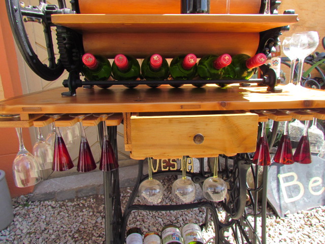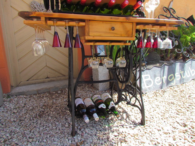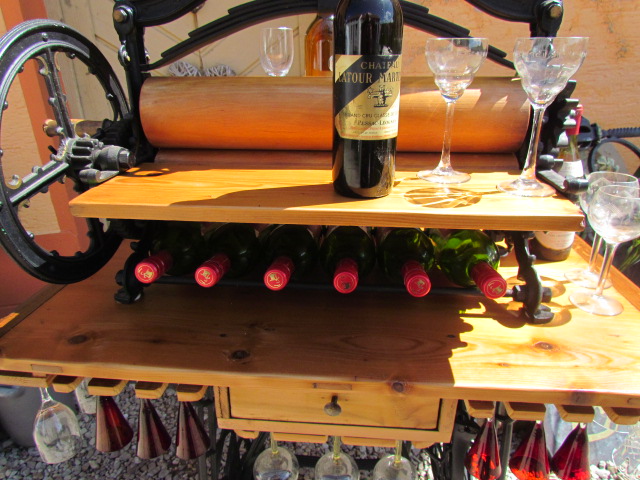 Sehr schöne Haus Bar gebaut aus einer alten Nähmaschinen Gestell und ein Wäschemangel aus Gusseisen .Alle Teile auch das Holz ist alt um 1900.Die Mangel bietet sehr viele Möglichkeiten zur Ablage von Weinflaschen und Gläser ,und zum anrichten auf beiden Seiten Abstellflächen. An der Tischplatten kann man neunzehn Weingläser aufhängen. Ein Schublade in der Mitte um bietet Platz um Kleinlichkeiten zum verstauen . Ein Einziger artiger Blickfang in jeder Wohnung und Fest. |