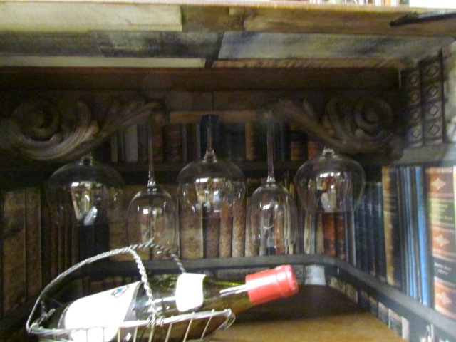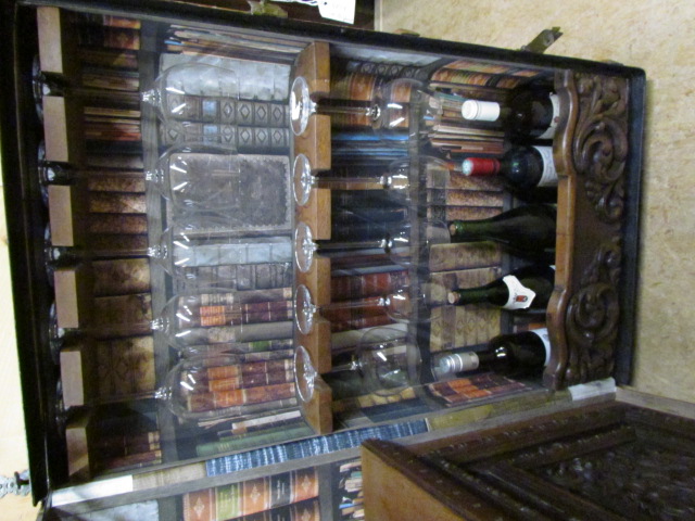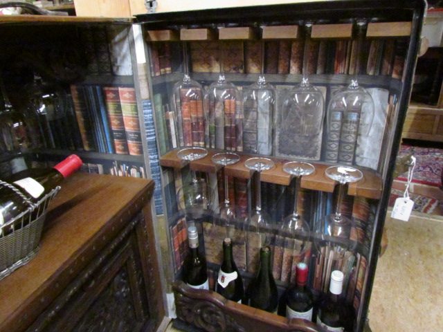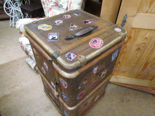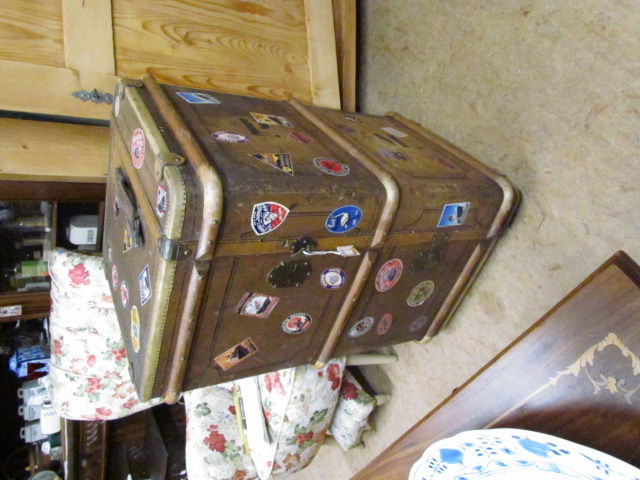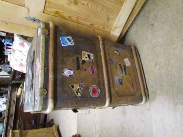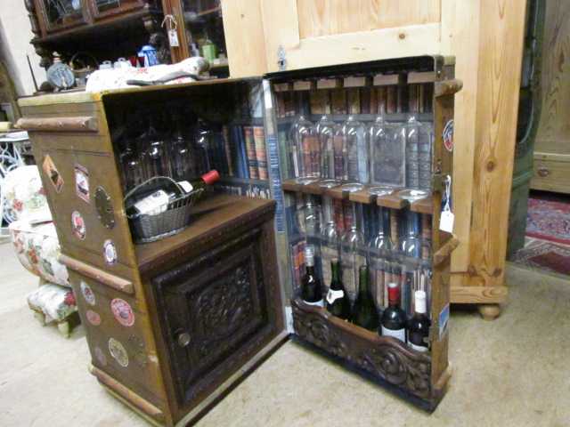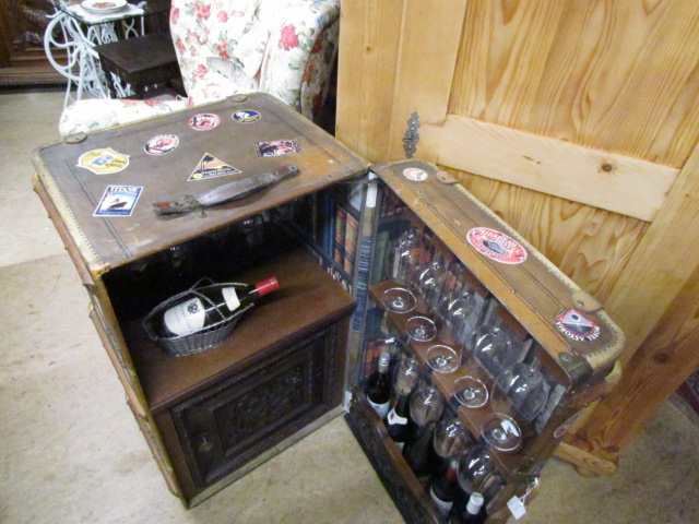 Alter Übersee Koffer um 1890. Er wurde Umgebaut zur Hausbar. Innen mit einem schönen Tapete ausgeschlagen. Es wurde ein alte Tür von einem alten Schrank eingebaut hinten einen Galerie .Oben Glashalter für fünf Gläser. Rechts Gläserhalter für zehn Gläser unten Abstellfläche für Weinflachen 0.75 l. Außen gestaltet mit Hotel Aufkleber. Preis Inklusiv der Gläser. |
