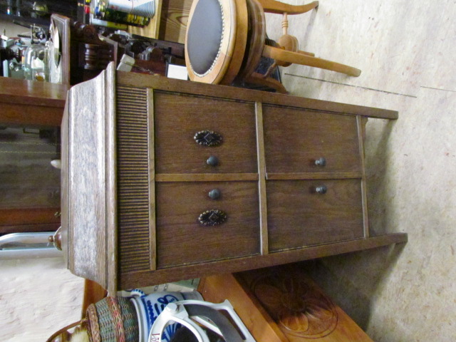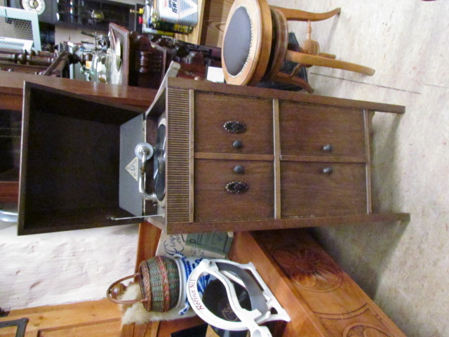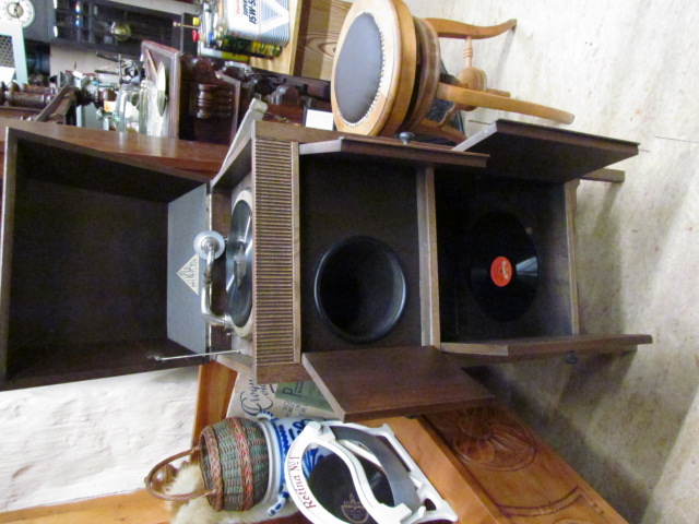 Grammophon um 1910. Es ist Spielbereit. Das Schränkchen ist Eiche Furniert. Die Lautstärke kann über die Türen an der Front reguliert werden. Man kann 70-100 Umdrehungen einstellen.