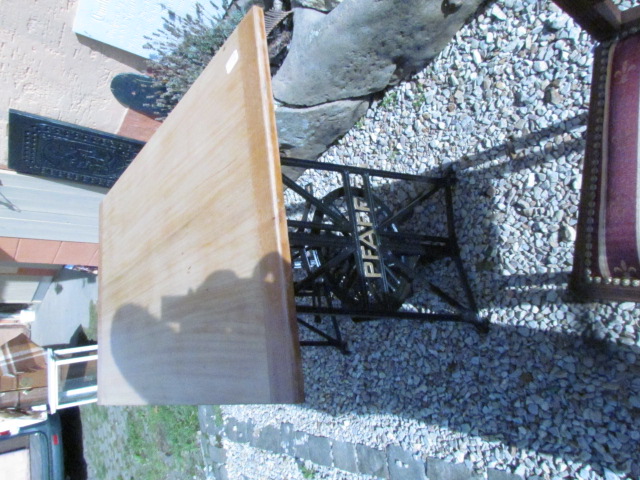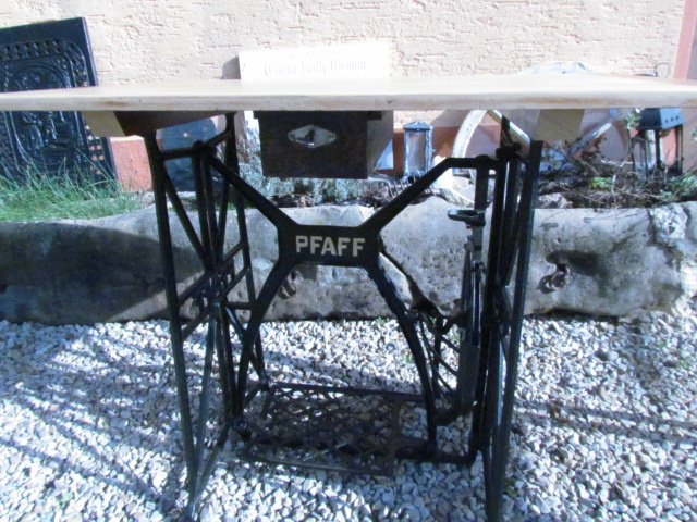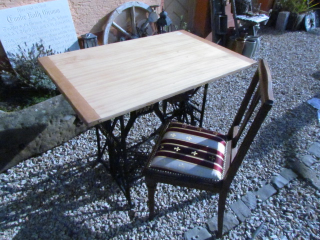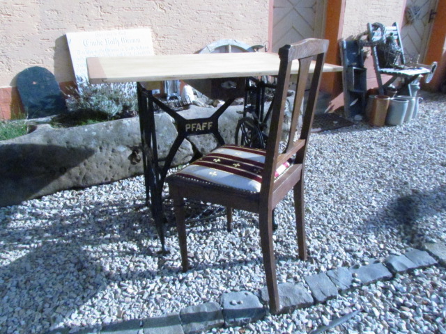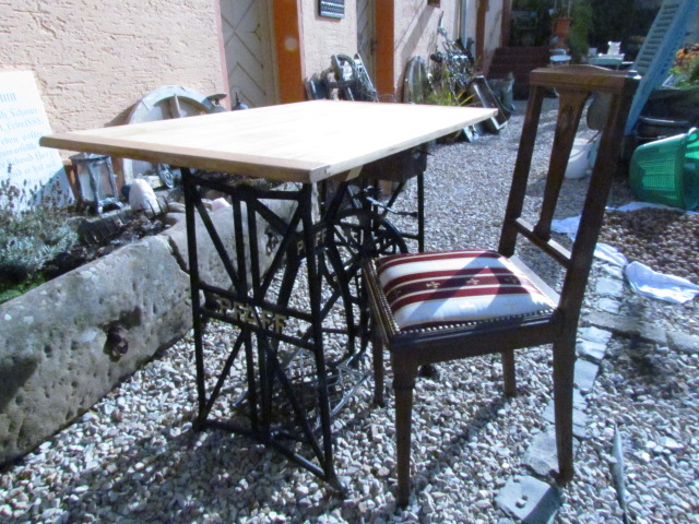 Schreibtisch gebaut aus einer alten Nähmaschine. Das Untergestell ist aus Eisenguss und von der Firma Pfaff. Zu dem Tisch gehört ein Jugendstil Stuhl dazu.