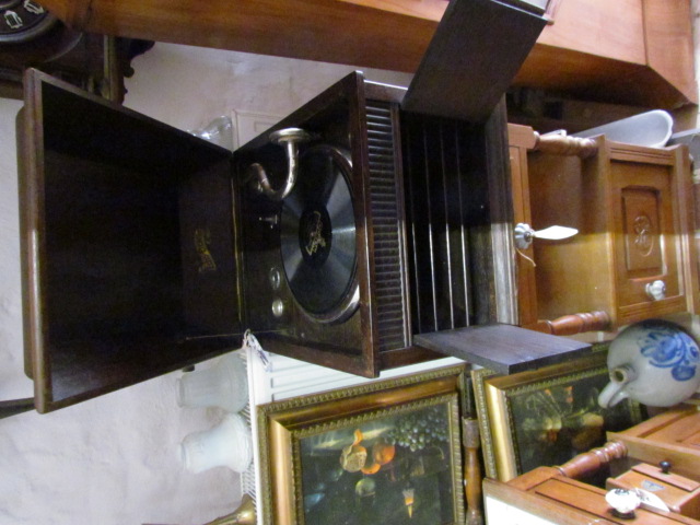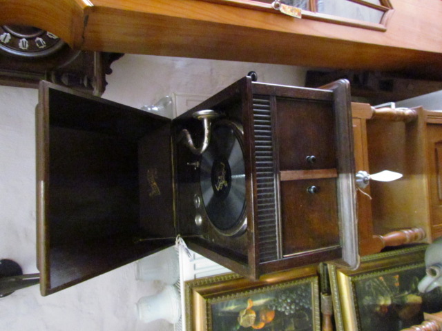 Tisch Grammophon um 1910 in einem guten Zustand. Sehr schöner Klang , hinter den Türen ein Lautsprecher .man kann verschiedene Geschwindigkeiten einstellen.