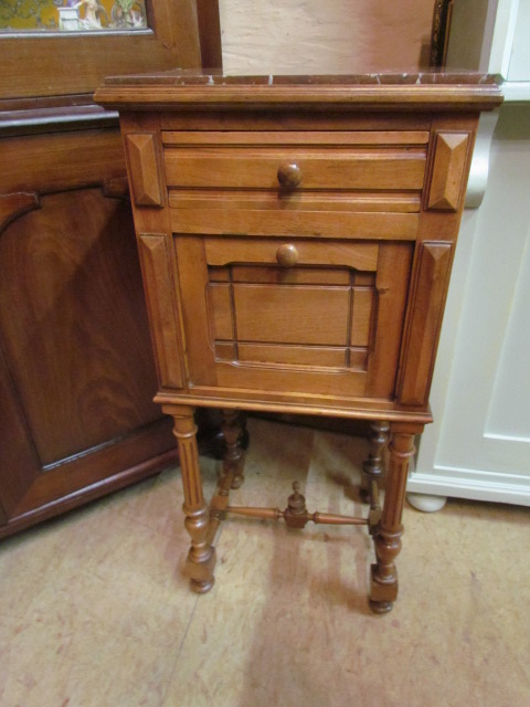Kleiner Nachttisch aus massiven Eichenholz um 1900 im Gründerzeit Stil mit roter Marmorplatte. |