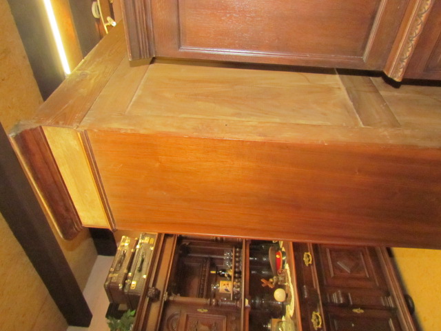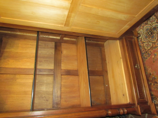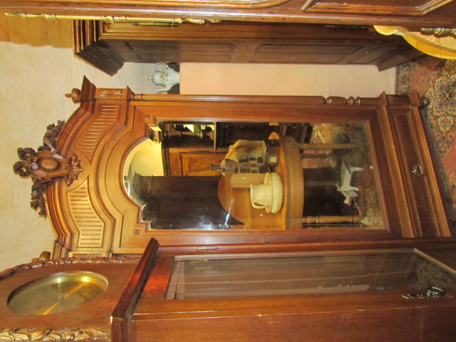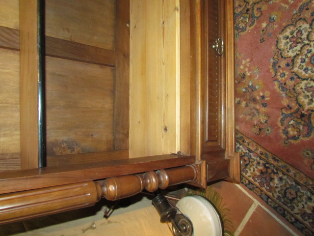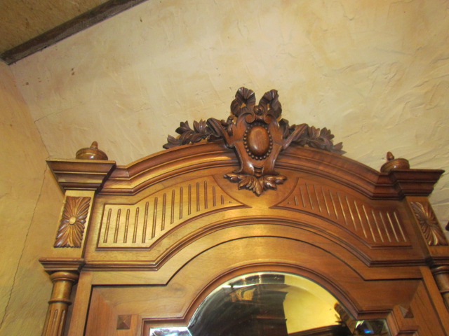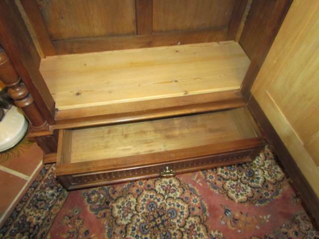 .Eintüriger Spiegelschrank um 1890.Der Schrank wurde aus massiven Eichenholz gefertigt. Der Spiegel ist mit ein Facettenschliff versehen. Seitlich mit Vollsäulen, unten mit einer Schublade.