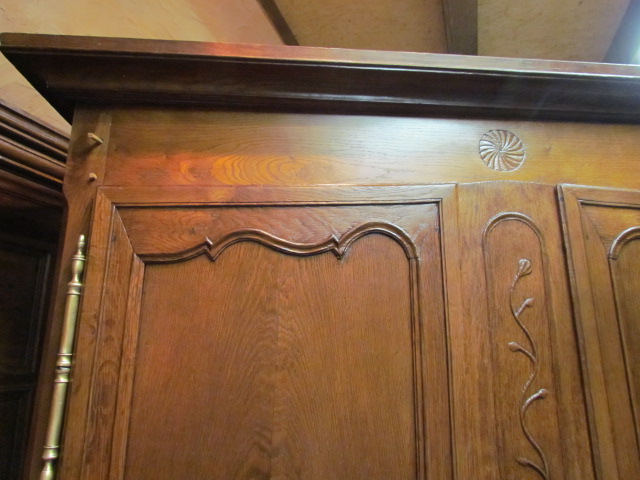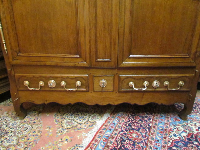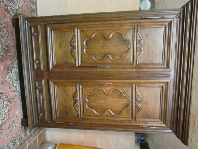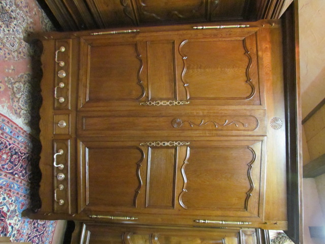 Repräsentativer Barock Schrank ein original aus der Zeit .Er ist Innen in der Schubladen Front Datiert in Römischen Zahlen 1667. Lesbarer Name Marc Poulain. Der Schrank ist für sein alter von 337 Jahren in einem guten zustand.Er wurde nur sauber gemacht und mit Wachs behandelt. Der Schrank ist mit seiner Tiefe von 80 cm außer gewöhnlich Tief.Er ist 180 breit und 230 hoch. Zum Bau des Schrankes wurde massives Kastanien Holz verwendet in einer sehr schweren Ausführung , die Füllungen Seitlich sind aufgesetzt.Die Beschläge wurden aus Eisen geschmiedet . Der Barock Schrank ist aus Frankreich aus der Region Nancy aus einem Bäuerlichen Herrenhaus.