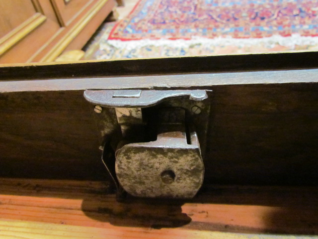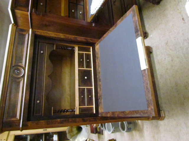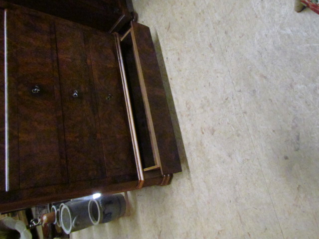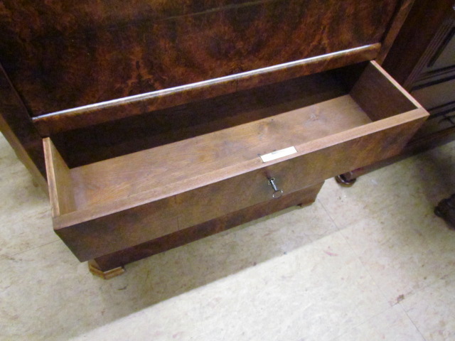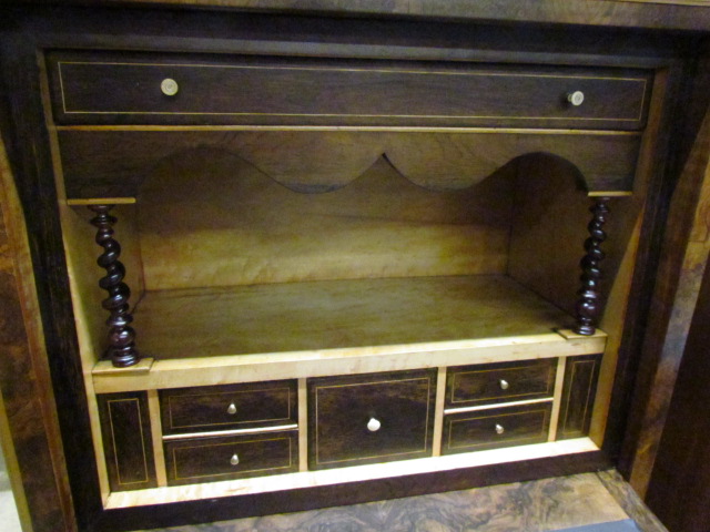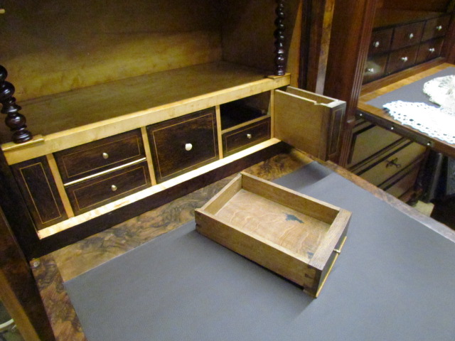 Stand Sekretär aus der Louis Phillip Zeit.Der Sekretär ist aus Nussbaum Furnier.Vorne hat Er eine Versteckte Schublade im Sockel.Im Innen Teil befindet sich zwei Geheime Schubladen die sich mit einem Versteckten Mechanismus geöffnet werden kann.