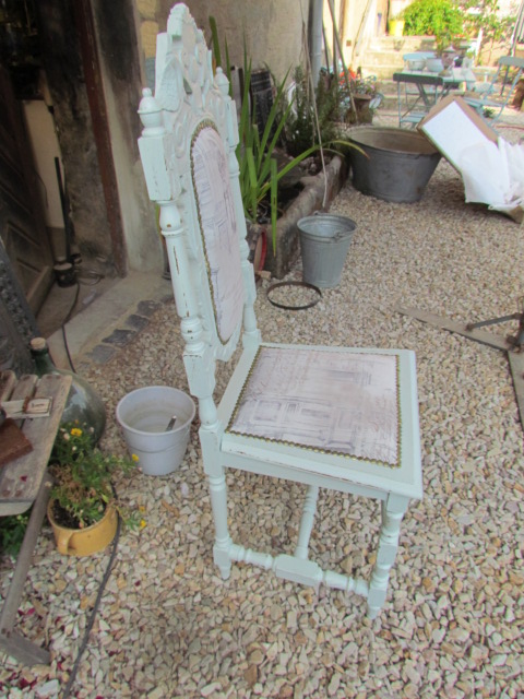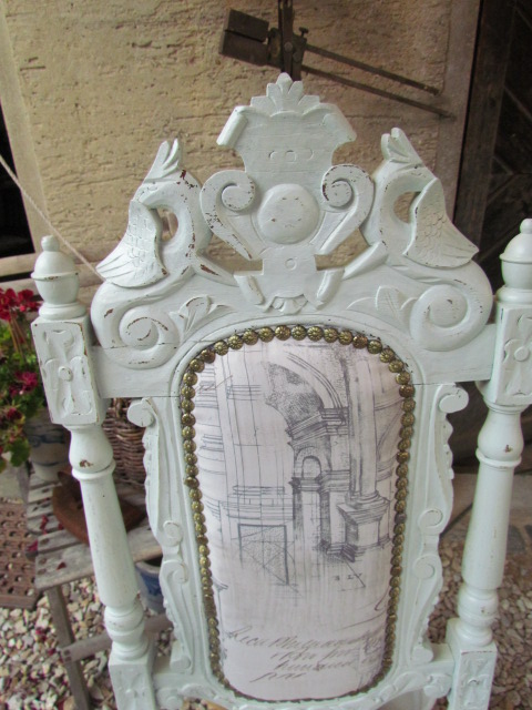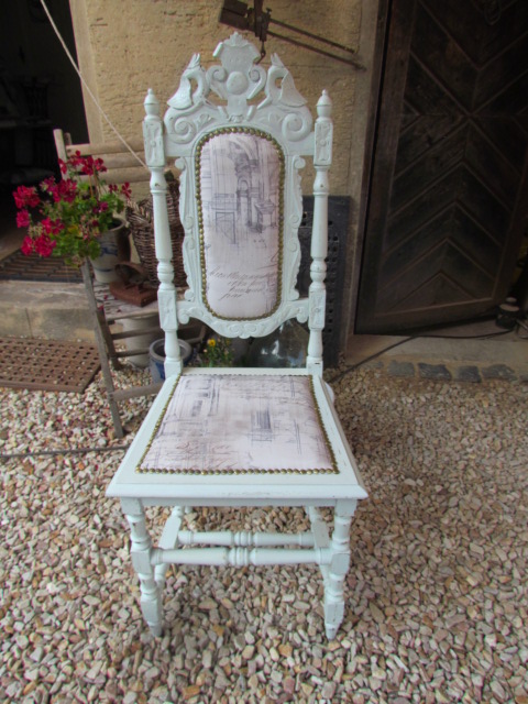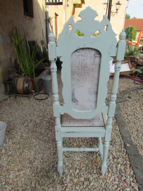 Sechs schöne hoch Lehner Stühle aus Frankreich.Sie wurden neu verleim .Die Polsterung wurde komplett erneuert und mit einem hellen Shabby chic Stoff bezogen.Das Gestell ist in einem Türkis Farbton gestrichen u. angeschliffen so das Sie ein Vintage Look haben. |