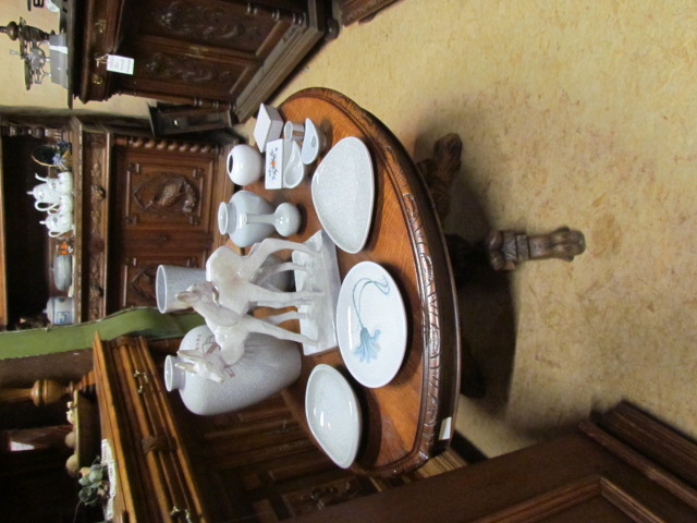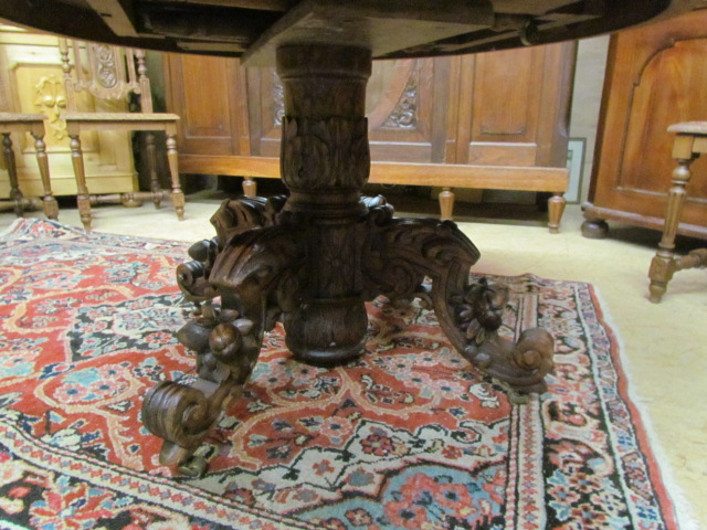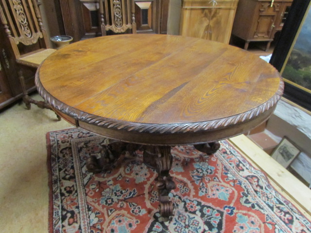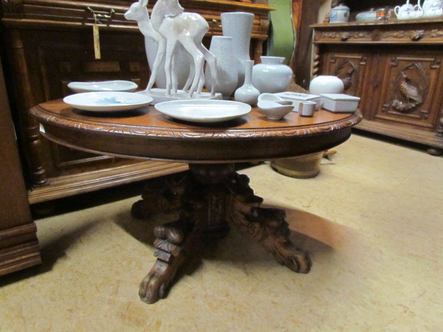 Wohnzimmer Tisch aus massiver Eiche Die Blatte ist Oval und lackiert. Mit einem Mittelfuß und drei auslaufende Füße die als Tier Fabelwesen gestaltet sind. Er wurde aus einem alten Tisch aus Frankreich gebaut |