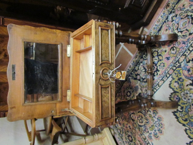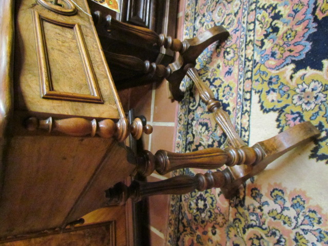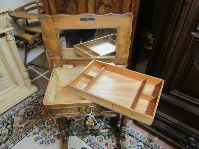 Nähtisch im Louis Philipp Stil um 1850 in Nussbaum Furnier .Innen mit einem Spiegel und ein Herausnehmbares Gefach. |