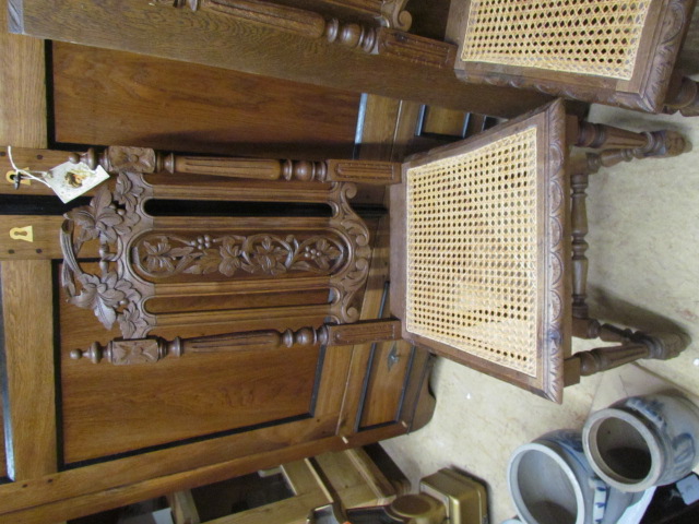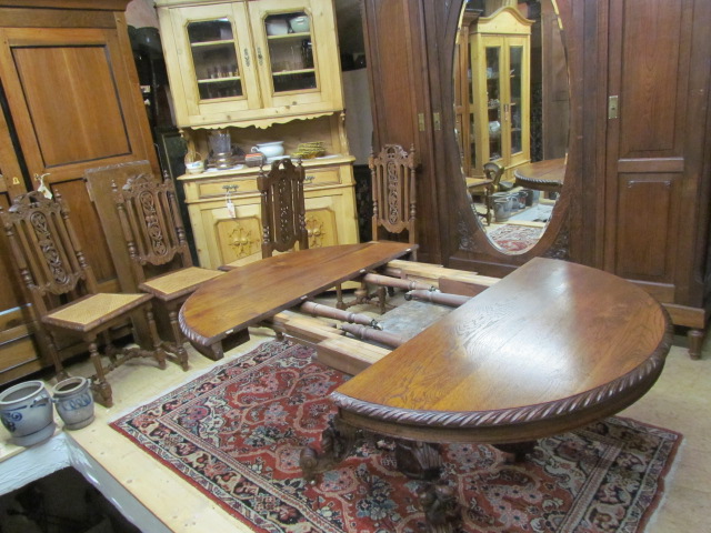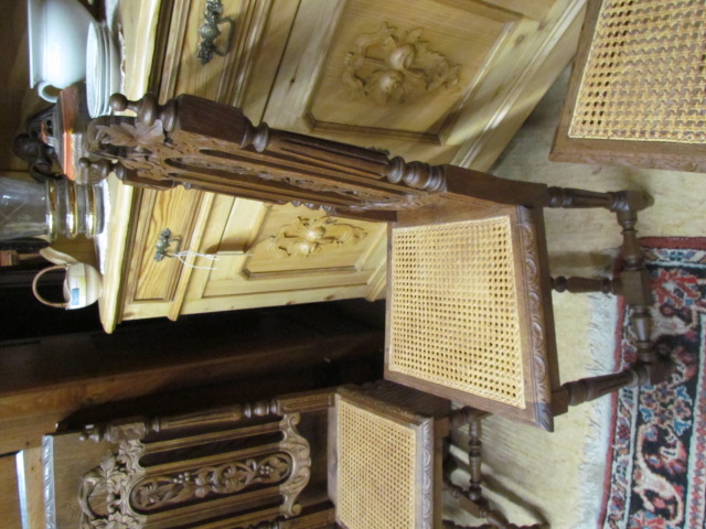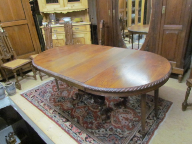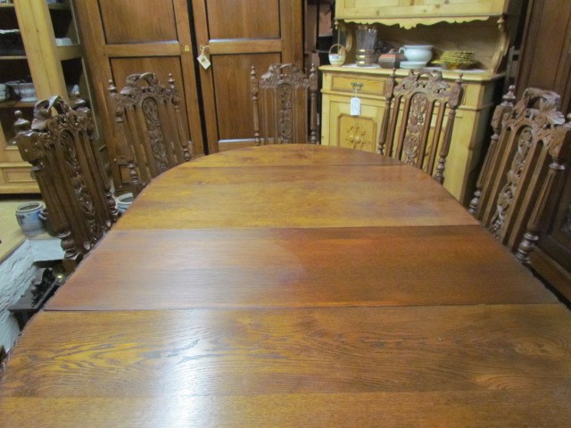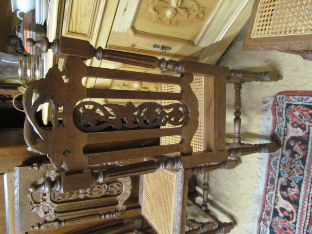 Großer Esszimmertisch mit sechs Stühlen aus massiver Eiche er kommt aus Frankreich um 1890 im Henry II Stil. Die Stühle sind mit Korbgeflecht und in einem guten zustand. Der Tisch ist zum ausziehen auf 230 cm mit einer breite von 115.Es sind zwei originale Einlege Platte und die dritte ist nachgemacht .Mann kann ihn in vier verschieden Größen stellen.