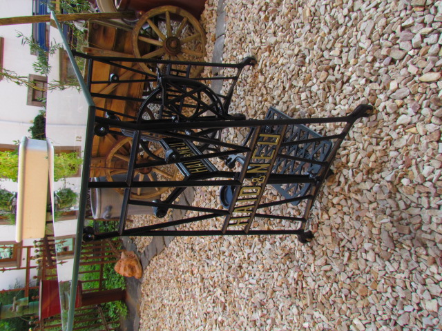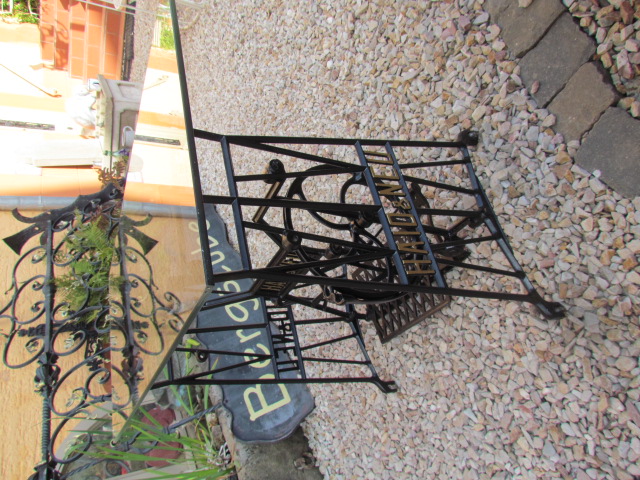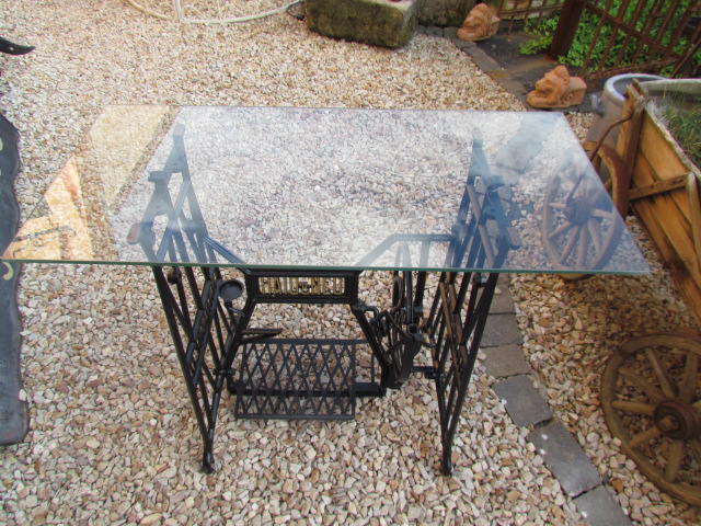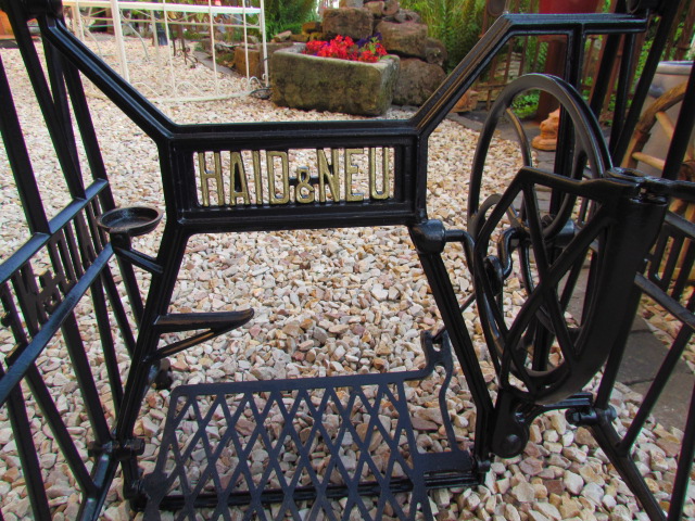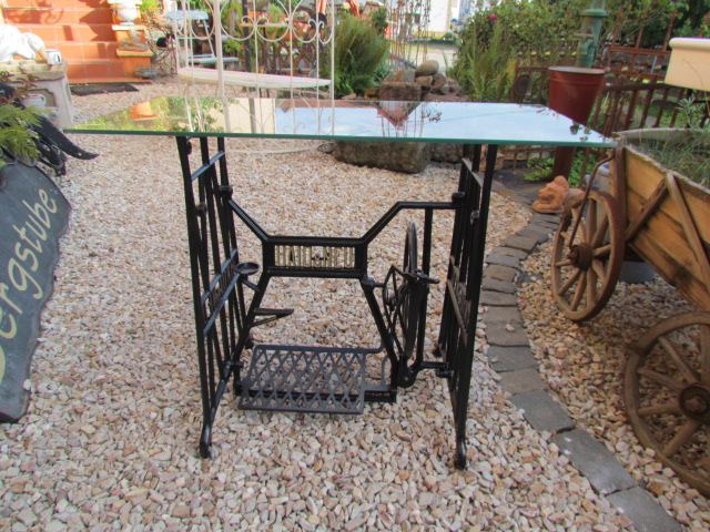 Alte Nähmaschine Untergestell aus Gusseisen. Von der Firma Haid u. Neu mit einer Glasplatte. |