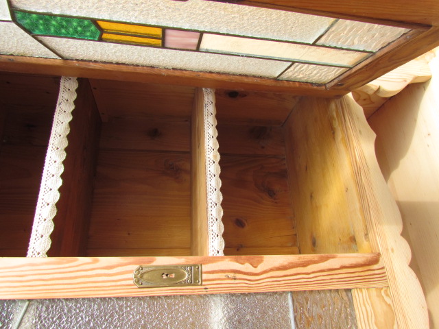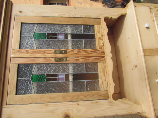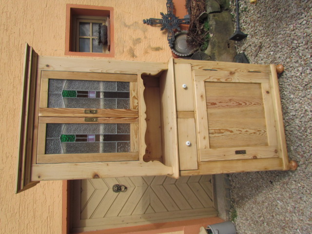 Kleiner Küchenschrank um 1900.Er ist aus Weichholz Tanne gefertigt.Oben Schöne Bleiverglasung die wohl später eingebaut wurde.Innen mit Einlege Böden.DerKüchenschrank ist Wohnfertig restauriert .Die Oberfläche ist mit Bienenwachs behandelt.