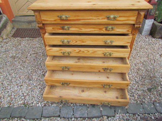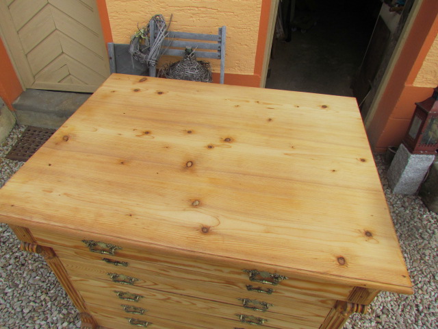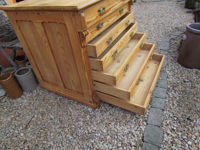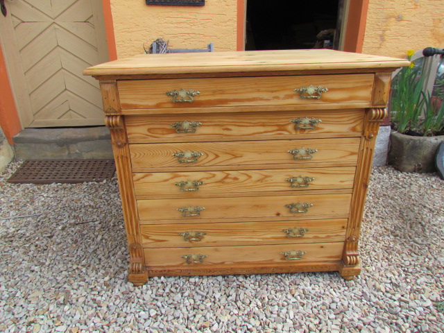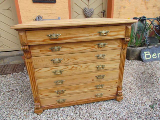 Große Kommode aus der Gründerzeit um 1880. Die Kommode hat einen Tiefe von 80cm was sehr selten ist . Wohl möglich aus ein alten Kaufmanns Laden. Sie hat sieben Schubladen mit Originalen Beschläge aus massiven Messing .Innen wie außen restauriert und gewachsen. Sie ist in eine sehr guten Zustand.
