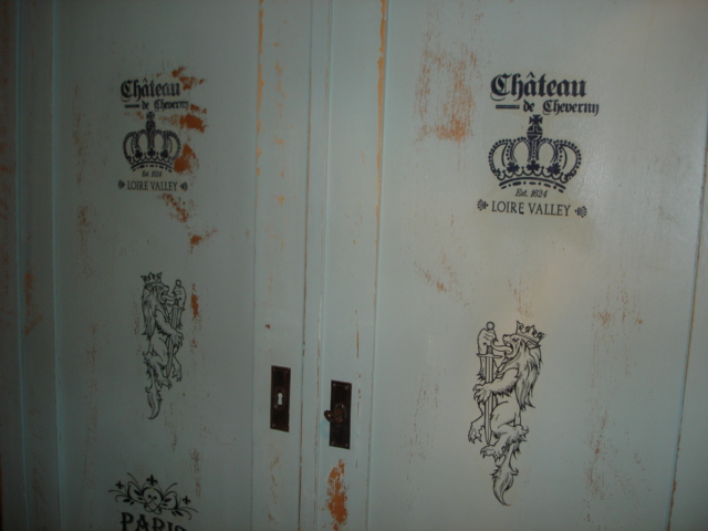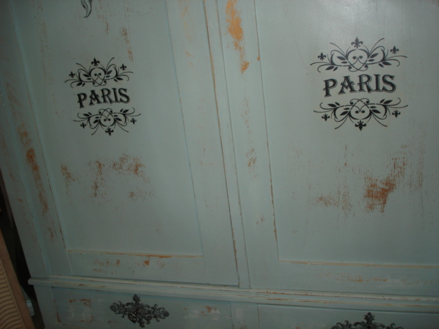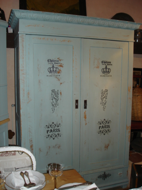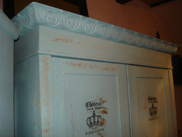 Der Schrank wurde im Shabby Chic Stil hergerichtet.Die Türkis Farbe wurde leicht angeschliffen so das er alt u. gebraucht aussieht die Türen sind mit Transfer Bildern verziert. Ihnen ist er mit einer Kleiderstange und Gefächer ausgestattet. |