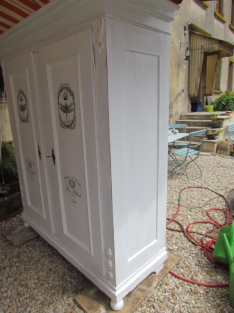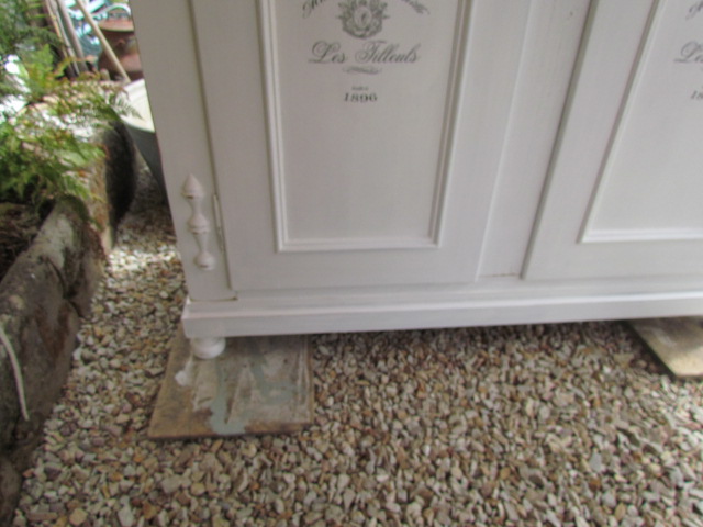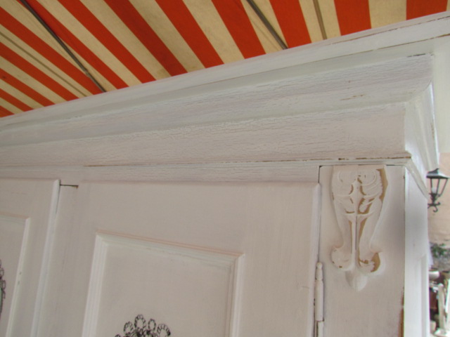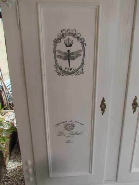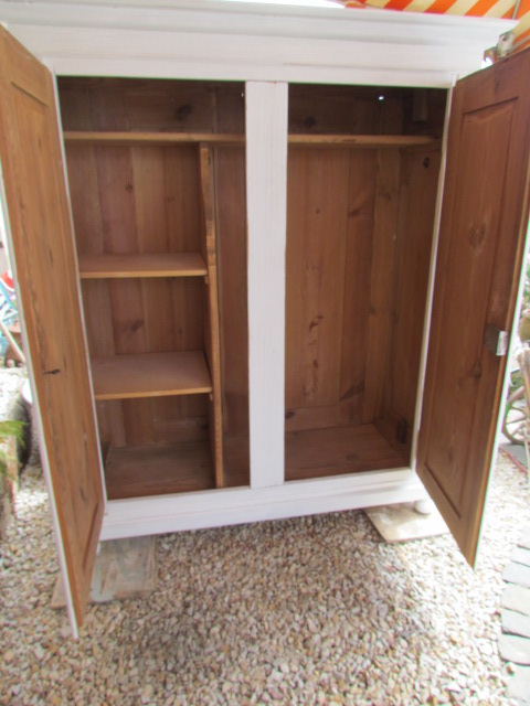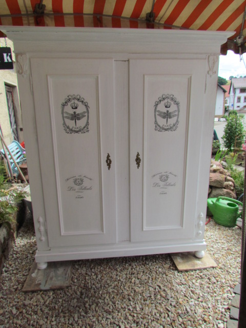 Der Schrank wurde im Shabby Chic Stil hergerichtet.Die Weiße Farbe wurde leicht angeschliffen so das er alt u. gebraucht aussieht die Türen sind mit Transfer Bildern verziert. Ihnen ist er mit einer Kleiderstange und Gefächer ausgestattet. |