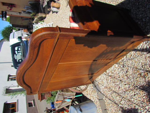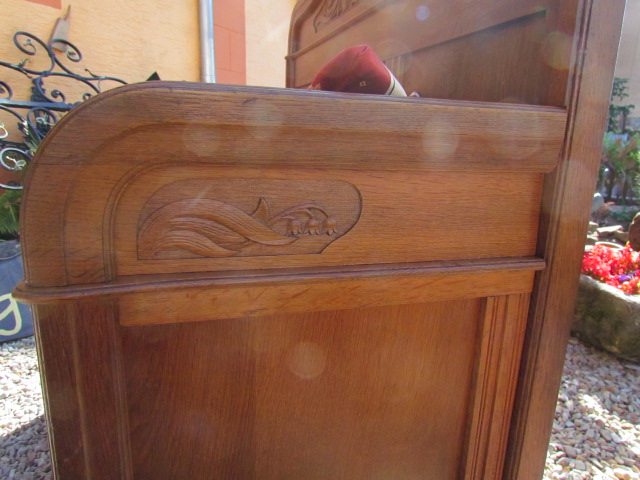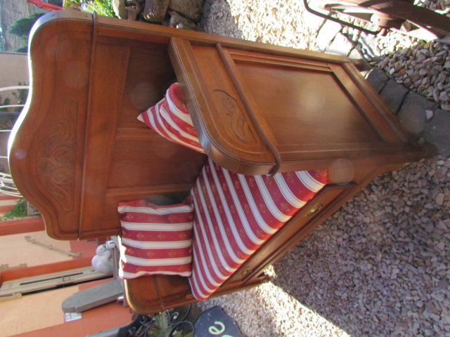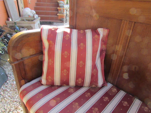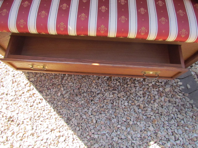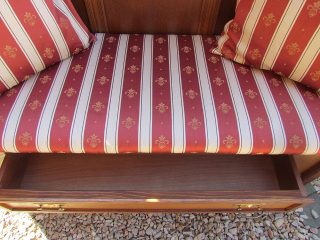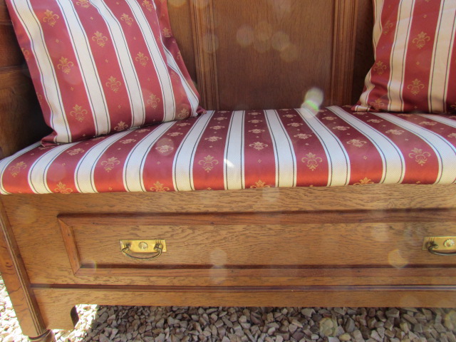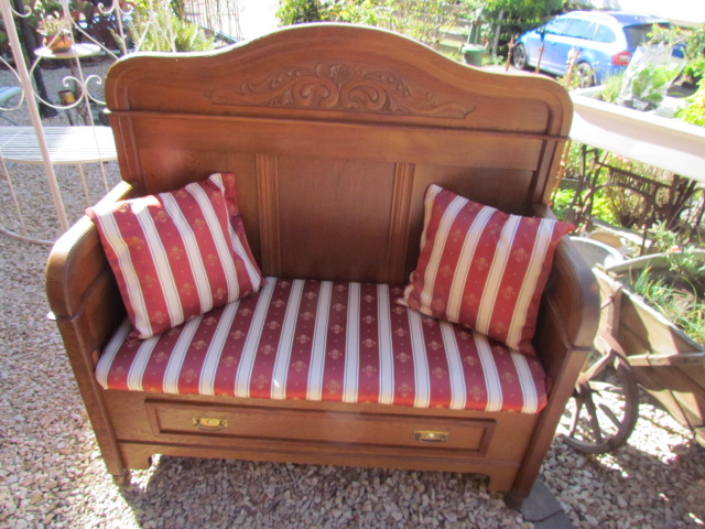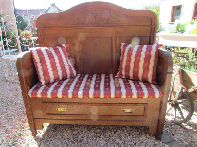 Große Bank aus Eichenholz.Sie wurde aus einem alten Bett gebaut.Unten mit einer Schublade die Sitzfäche ist mit einem Möbelstoff in rot mit Streifen bezogen. Oben und auf der Seite mit schönen Jugendstil versierungen versehen. Es gehören noch zwei Kissen dazu. |