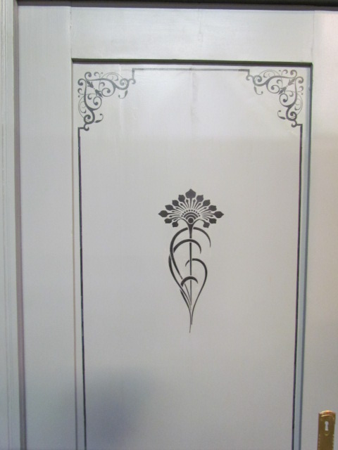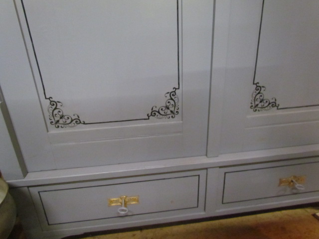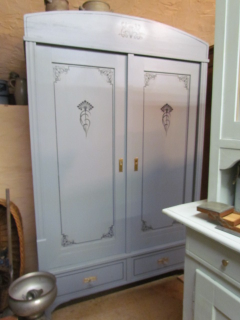 Kleiderschrank im Shabby Chic Stil mit Jugendstil Ornamenten.In eine blau grauen Farbton gestrichen. Er hat innen einen Kleiderstange und eine Ablage.
