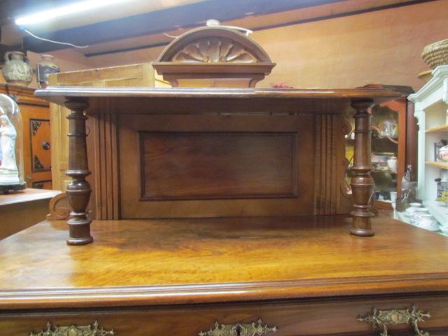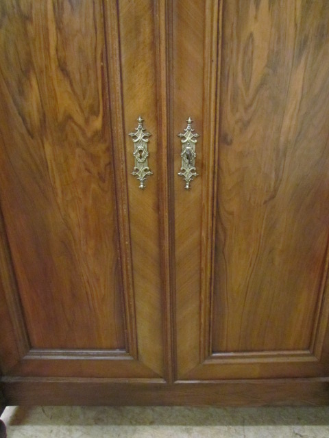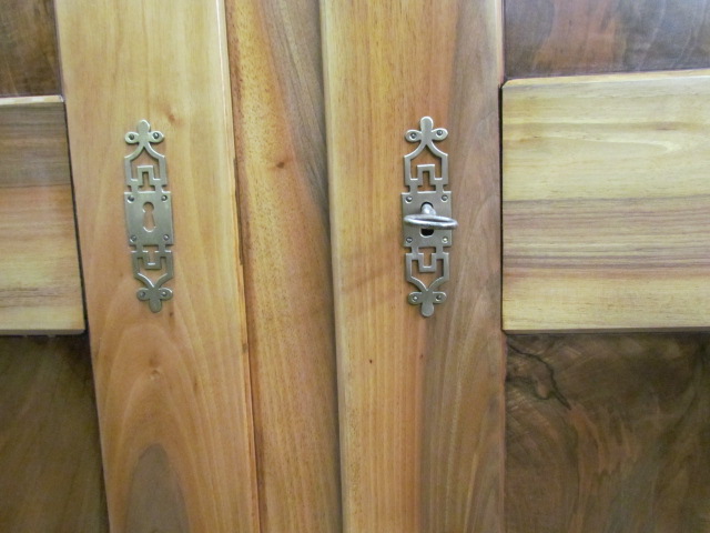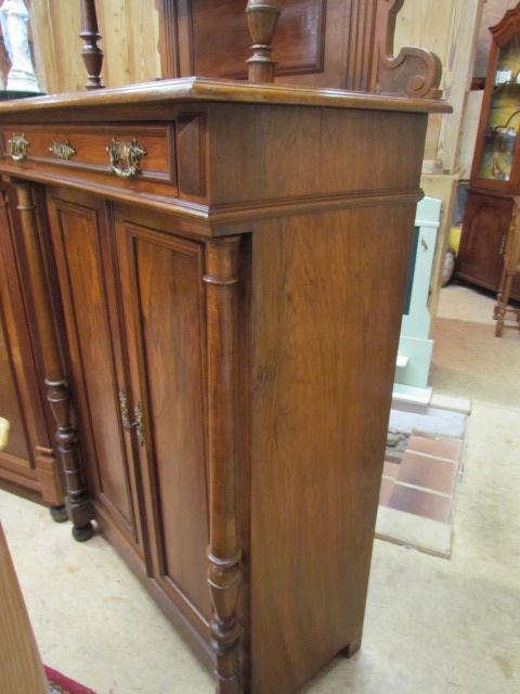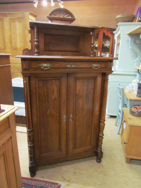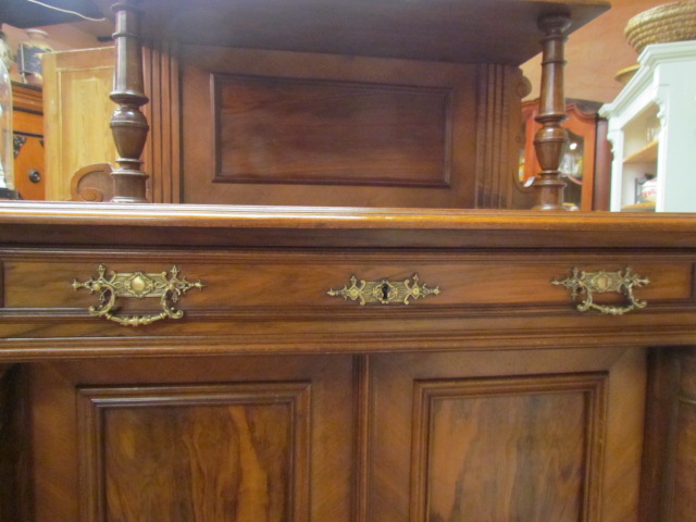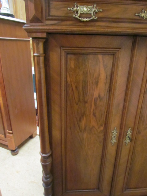 Vertiko aus der Gründerzeit um 1890.Es wurde in Straßburg/Elsass gefertigt Firmensignatur auf den Schlössern.Es ist Nussbaum furniert mit Vollsäulen die Beschläge sind original.Sehr schönes Vertiko in einem guten originalen Zustand ,die Oberfläche wurde nur aufpoliert Füße erneuert. |